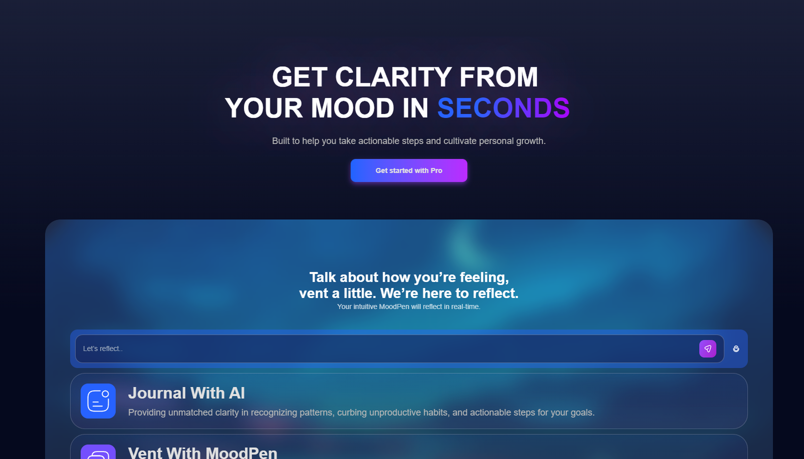 MoodPen is a platform designed to help people track and reflect on their emotions in order to take actionable steps towards personal growth. It features a journal with AI-provided personalized feedback, a venting chat system with real-time support, and mood insights to provide summaries and key takeaways. It also offers speech-to-text and multi-lingual support, as well as the ability to change the AI persona. It is available as either a subscription or a lifetime membership.